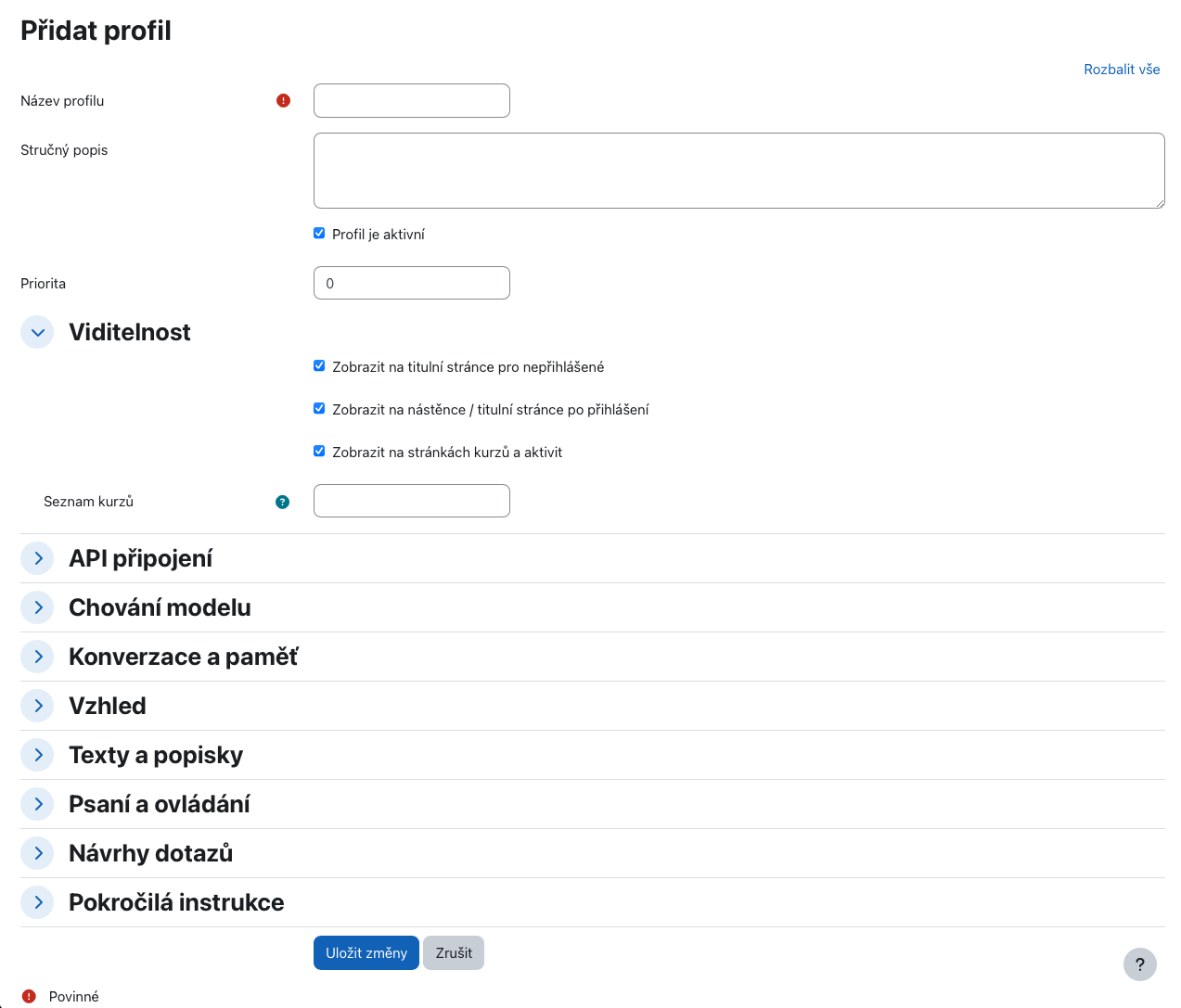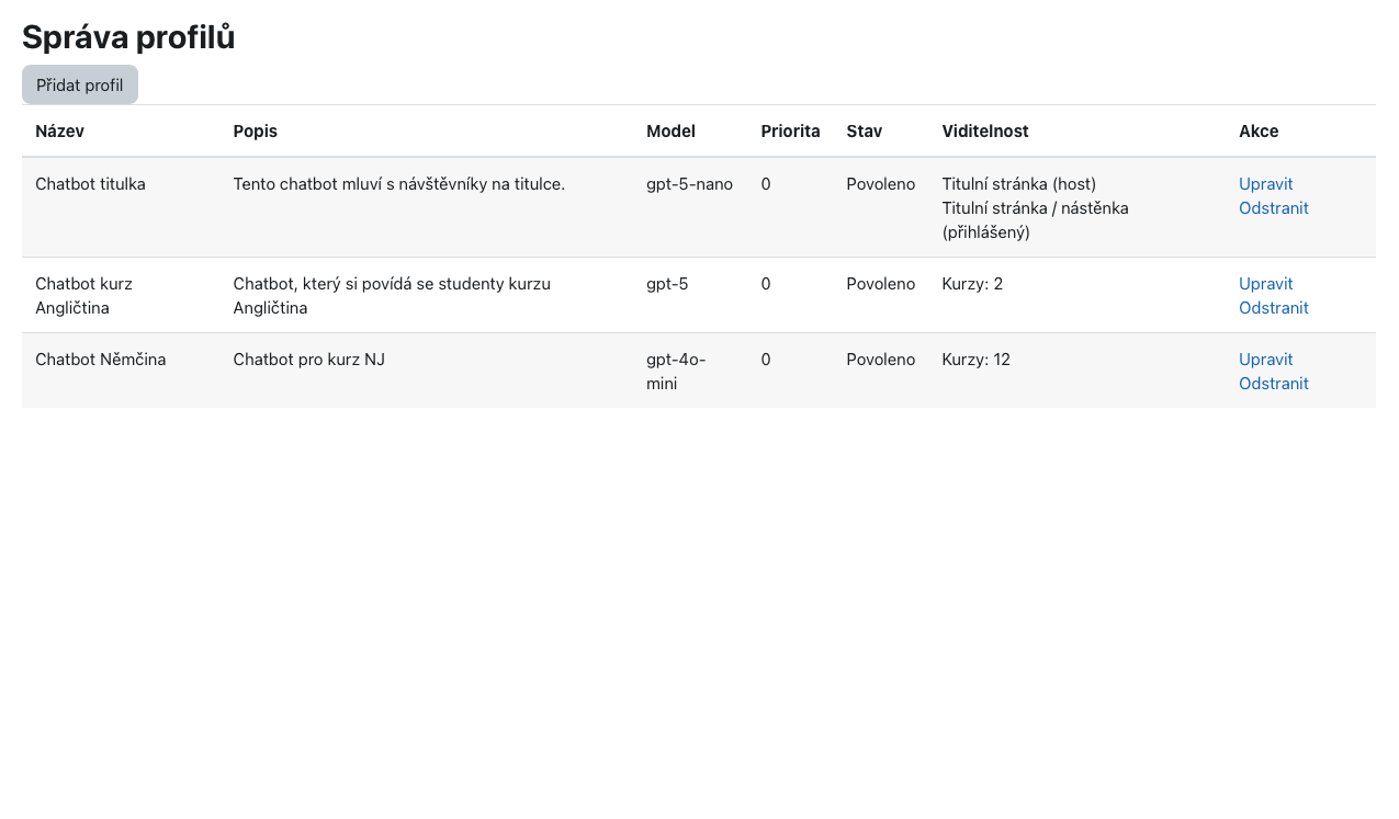 Můžete vytvářet více chatbotů a využívat je v různých kurzech. Každý chatbot má svou vlastní konfiguraci.