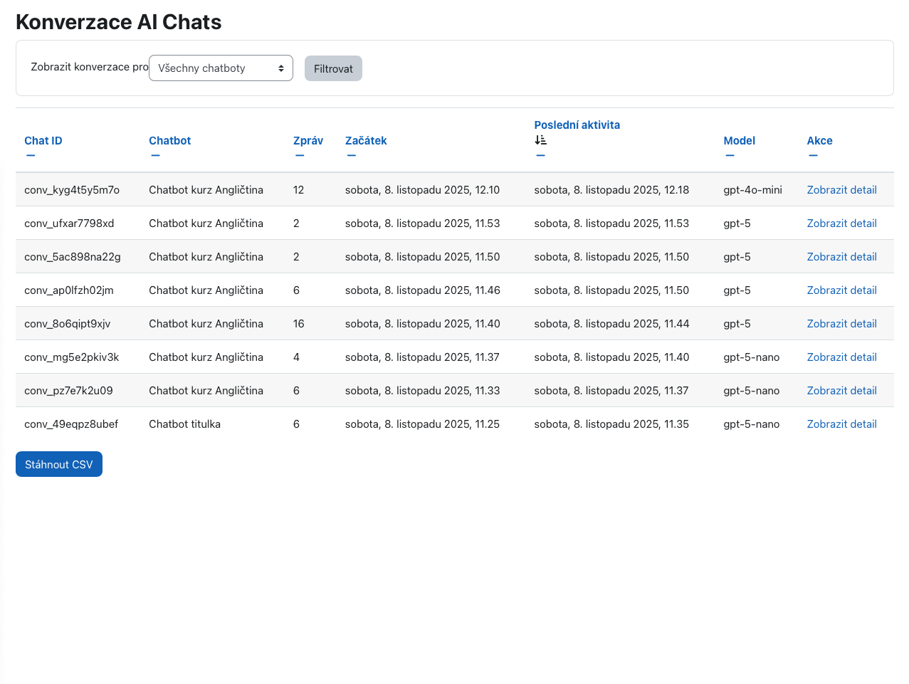 - Možnost exportovat detail konverzace do .CSV